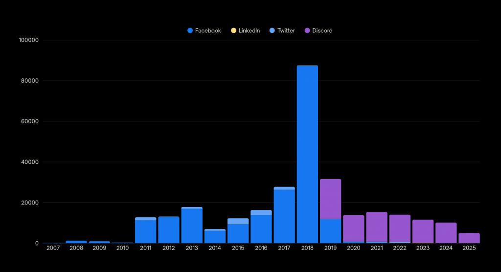 As part of my journey to use analytics and data for my own personal sociological, psychological, and philosophic interests into the concept of the self, I’ve been building a personal data archive. As of today, the sqlite database has 299,970 entries spanning 18 years of content and 4 social media platforms.