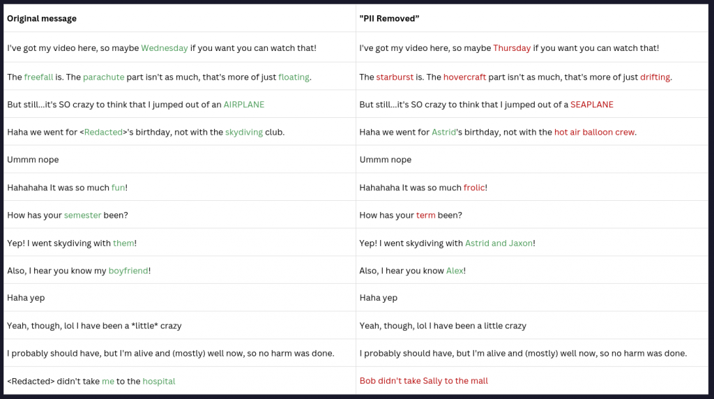 Another area of error was the identification of proper nouns. In my attempted PII cleaning, I found that the model I used (llama3.1:7b) had very high misclassification rates, which resulted in a high level of replacement text: